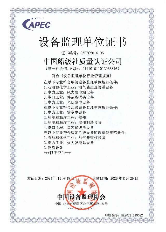 近日,我司通過(guò)了中國(guó)設(shè)備監(jiān)理協(xié)會(huì)專(zhuān)家委員會(huì)評(píng)審,于11月19日獲得了光伏發(fā)電設(shè)備監(jiān)理甲級(jí)資質(zhì)、集裝箱碼頭設(shè)備監(jiān)理乙級(jí)資質(zhì)。