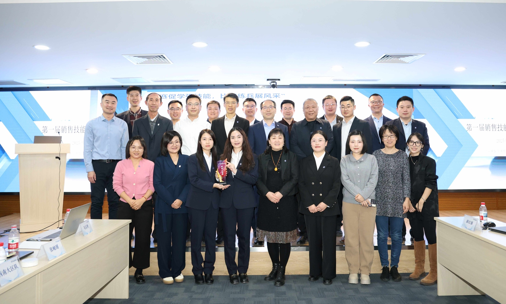 以賽促學(xué):三大維度見證成長蛻變。決賽現(xiàn)場高潮迭起,選手們在必答題環(huán)節(jié)展現(xiàn)扎實(shí)理論功底,搶答環(huán)節(jié)上演速度與激情的較量,案例實(shí)戰(zhàn)環(huán)節(jié)更是將專業(yè)能力推向新高度。東北大區(qū)的“雪中旭日隊(duì)”憑借精準(zhǔn)的市場洞察和高效解決方案摘得桂冠,西南大區(qū)獲得亞軍,西北大區(qū)和江浙聯(lián)隊(duì)分列季軍。正如公司黨委委員、工會(huì)主席、副總經(jīng)理付治深在賽前動(dòng)員中所言“比賽既是日常工作的檢驗(yàn),更是實(shí)戰(zhàn)能力的淬煉。不僅看到年輕人在壓力下快速成長,更要看到公司銷售團(tuán)隊(duì)的未來”。