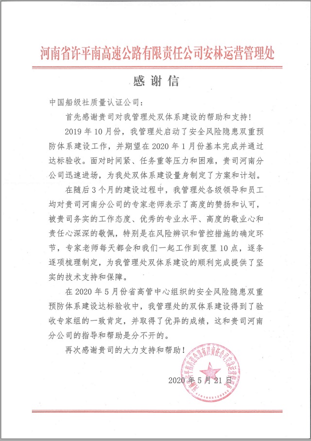 5月25日,河南分公司收到河南省許平南高速公路有限責任公司安林管理處發來的感謝信,感謝我司在該管理處安全風險隱患雙重預防體系建設工作中給予的幫助和支持!