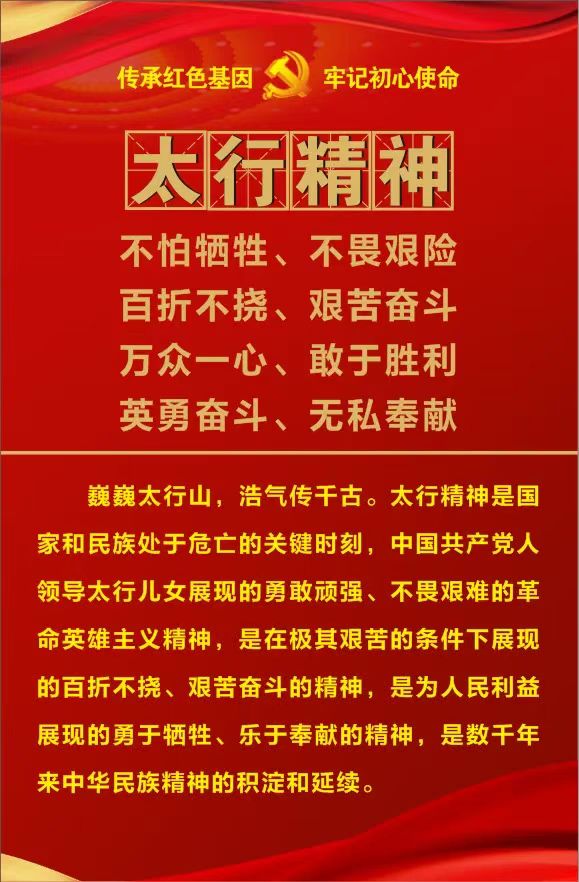 巍巍太行山,浩氣傳千古。太行精神是國家和民族處于危亡的關鍵時刻,中國共產黨人領導太行兒女展現的勇敢頑強、不畏艱難的革命英雄主義精神,是在極其艱苦的條件下展現的百折不撓、艱苦奮斗的精神,是為人民利益展現的勇于犧牲、樂于奉獻的精神,是數千年來中華民族精神的積淀和延續。
