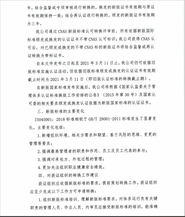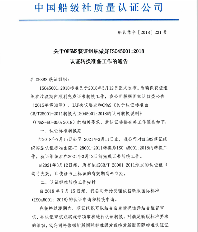 關于OHSMS獲證組織做好ISO45001_2018認證轉換準備工作的通告
